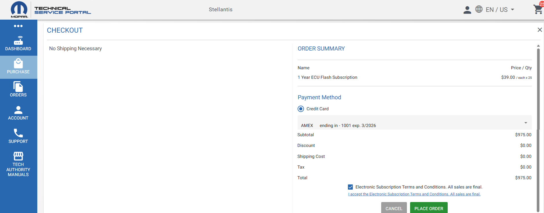 - Log into the Mopar Technical Service Portal as the account owner and purchase a VRS as described in the steps above in "Purchasing a VRS directly via the Mopar Technical Service Portal (MTSP) Page"