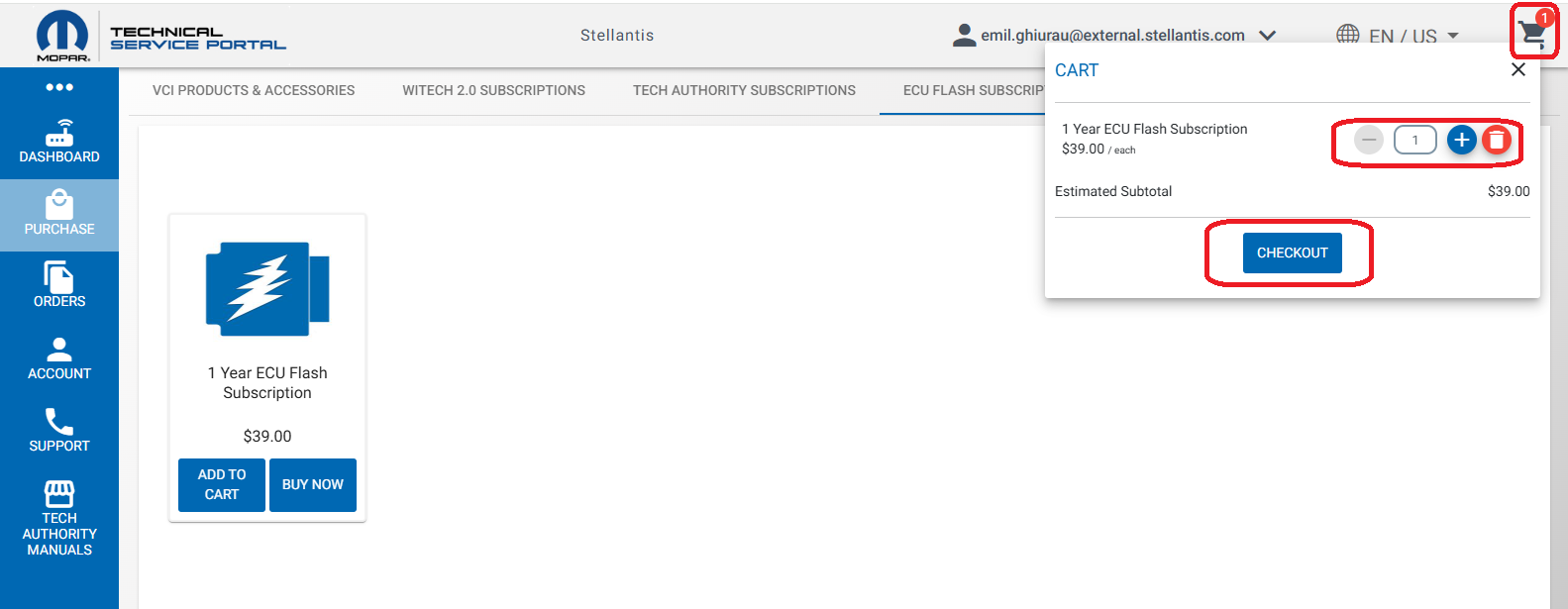 - Log into the wiTECH MTSP page, https://mopartsp.com/, select "Purchase" from the left side menu, select "ECU Flash Subscriptions" from the top menu, then select "Add to Cart" or "Buy Now".