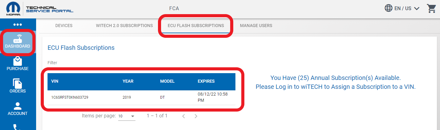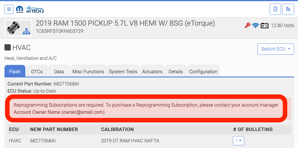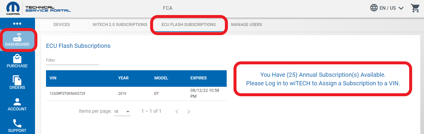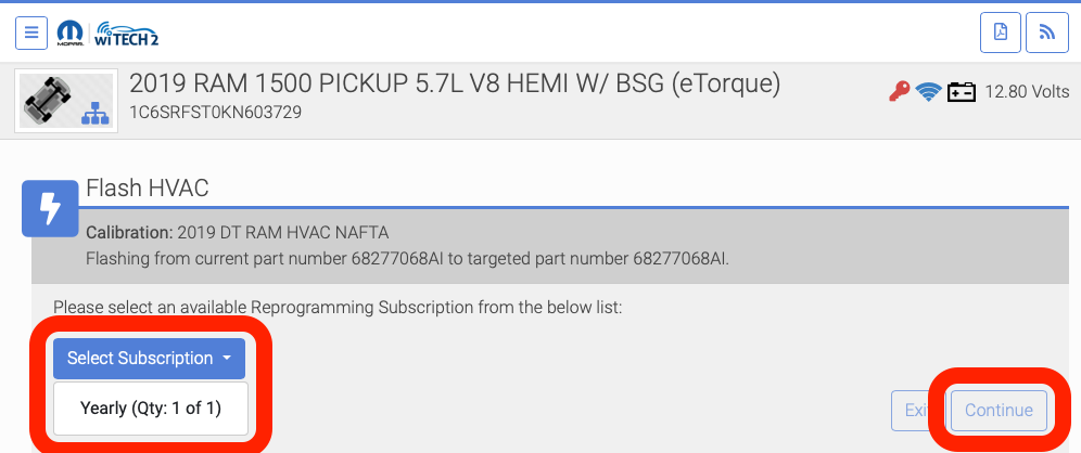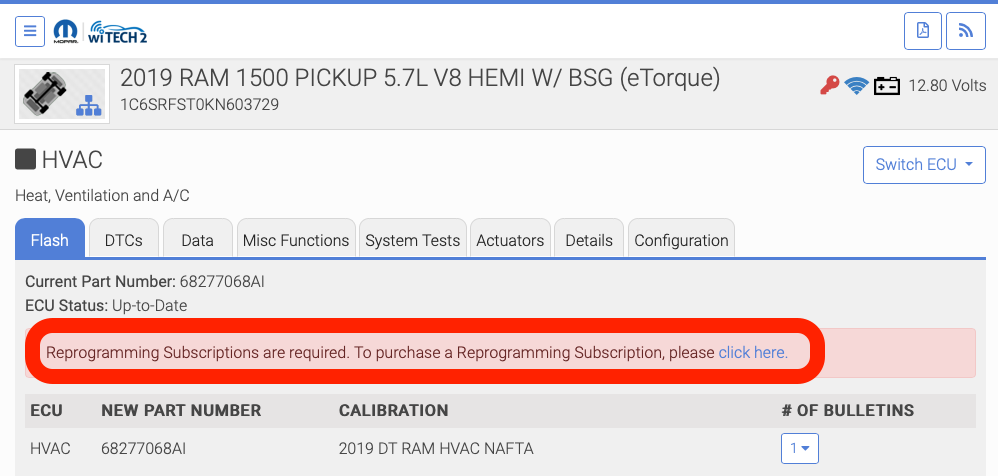 wiTECH 2.0 Aftermarket customers are required to purchase a Vehicle Reprogramming Subscription to flash FCA vehicles. The Reprogramming Subscription fee is $35 per VIN for a one year Reprogramming Subscription. Each flash subscription purchased allows the user to flash all ECUs requiring an update on a single VIN. After a flash subscription is purchased, it is activated when the first flash is performed in wiTECH. The flash subscription will remain active for one year following the first flash performed. The one-year subscription grants the user unlimited flash to the specific VIN for one year after the first flash is performed. If the same vehicle requires flash updates after the 1-year subscription has expired, another VRS must be purchased. If the wiTECH user wishes to flash multiple vehicles, a separate VRS must be purchased for each vehicle requiring flash updates.