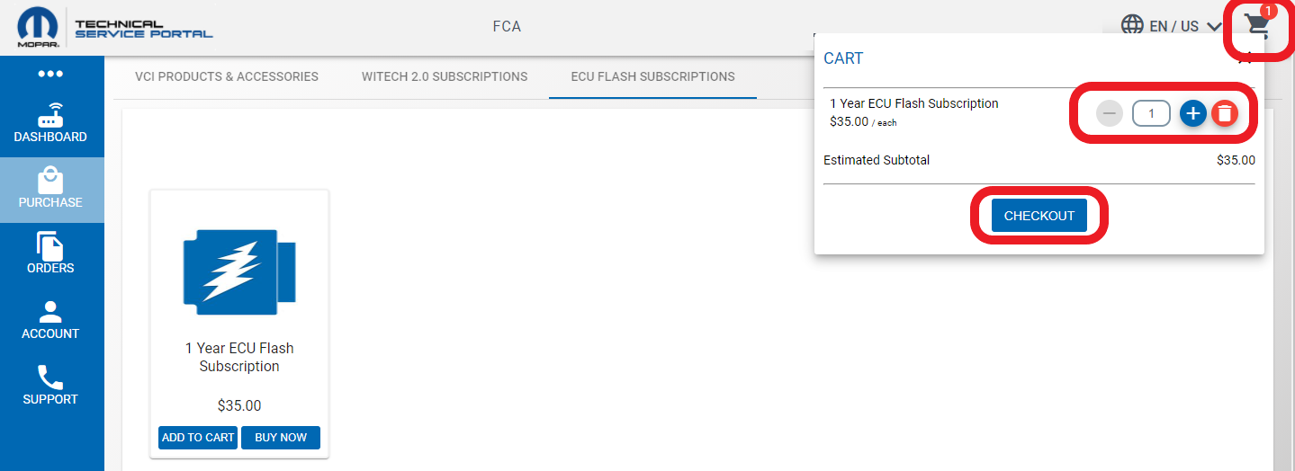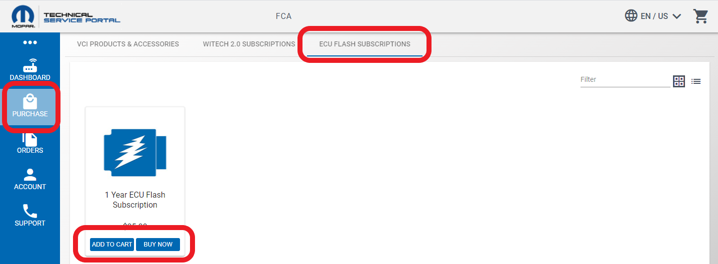 - Log into the wiTECH MTSP page, https://mopartsp.com/, select "Purchase" from the left side menu, select "ECU Flash Subscriptions" from the top menu, then select "Add to Cart" or "Buy Now".