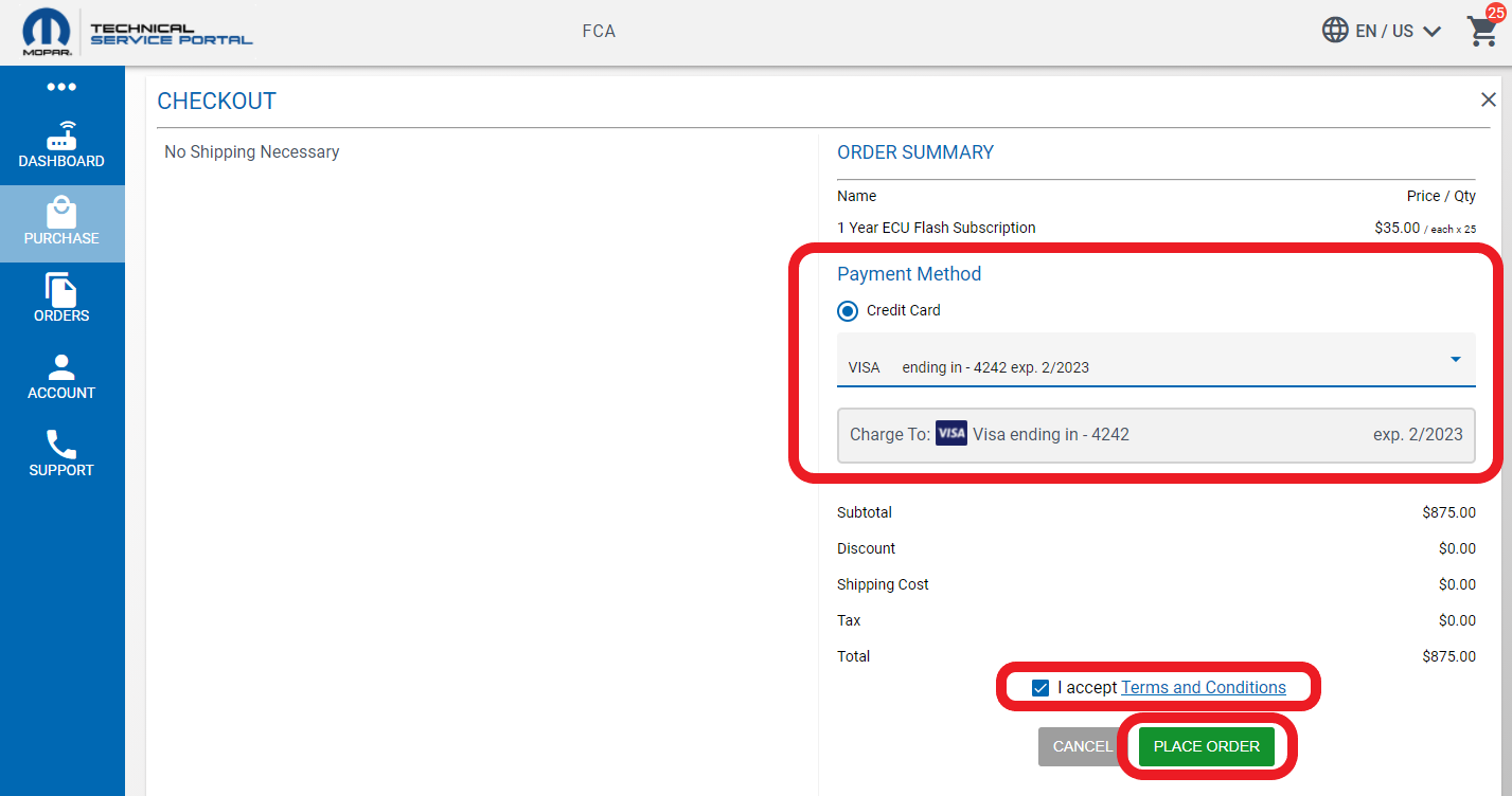 - Enter your credit card information, agree to the Terms and Conditions, and select "Place Order".