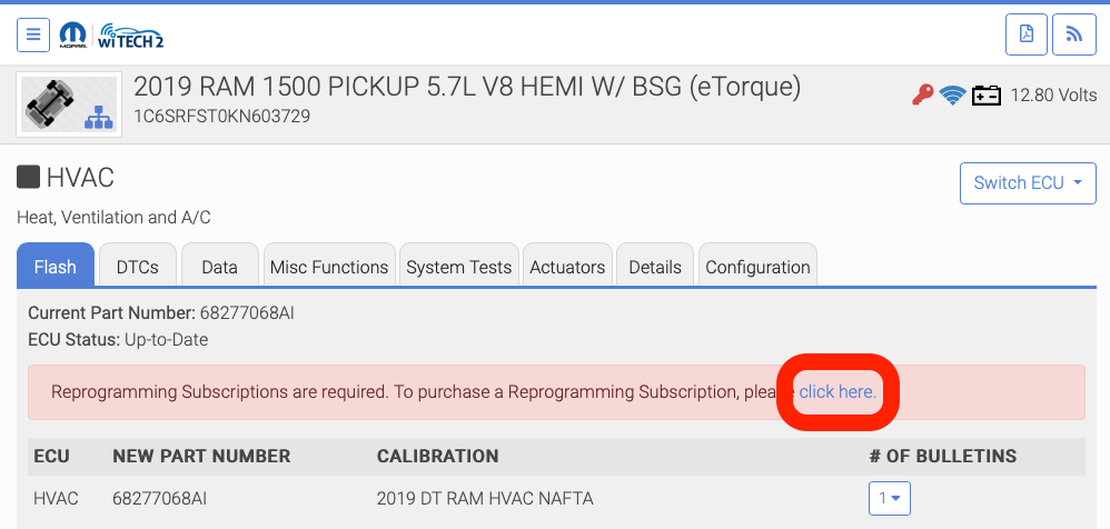 - From the Flash tab in wiTECH, select “click here” to navigate to the MTSP to purchase a VRS.