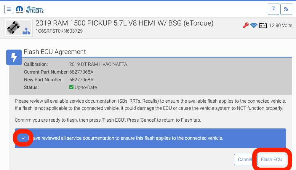 - After you’ve reviewed the information, check the checkbox and select the “Flash ECU” button.